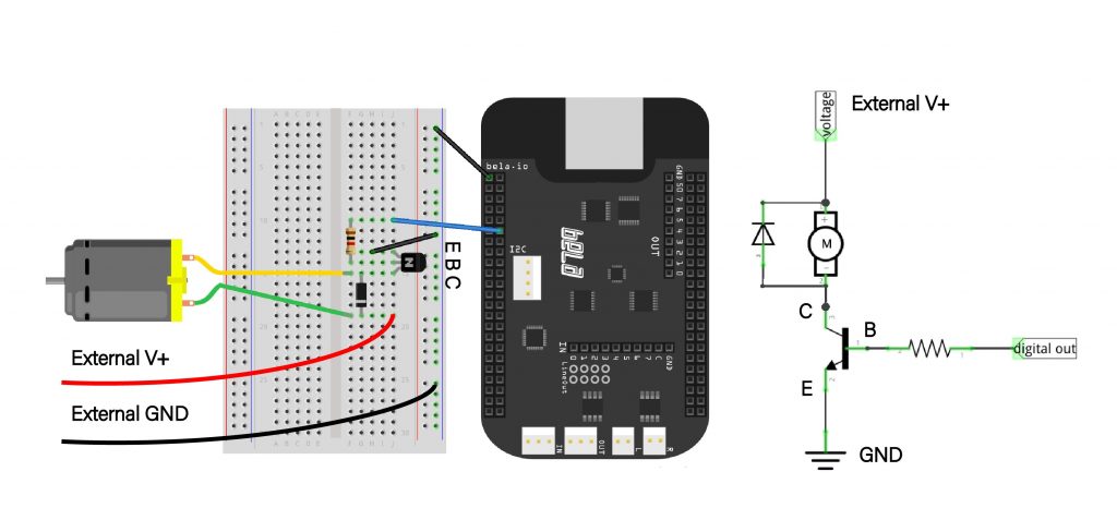 My last resort to get this idea to work was to try a schematic from a forum online which uses external power and the bela as a signal sender to control the external power to the motor.